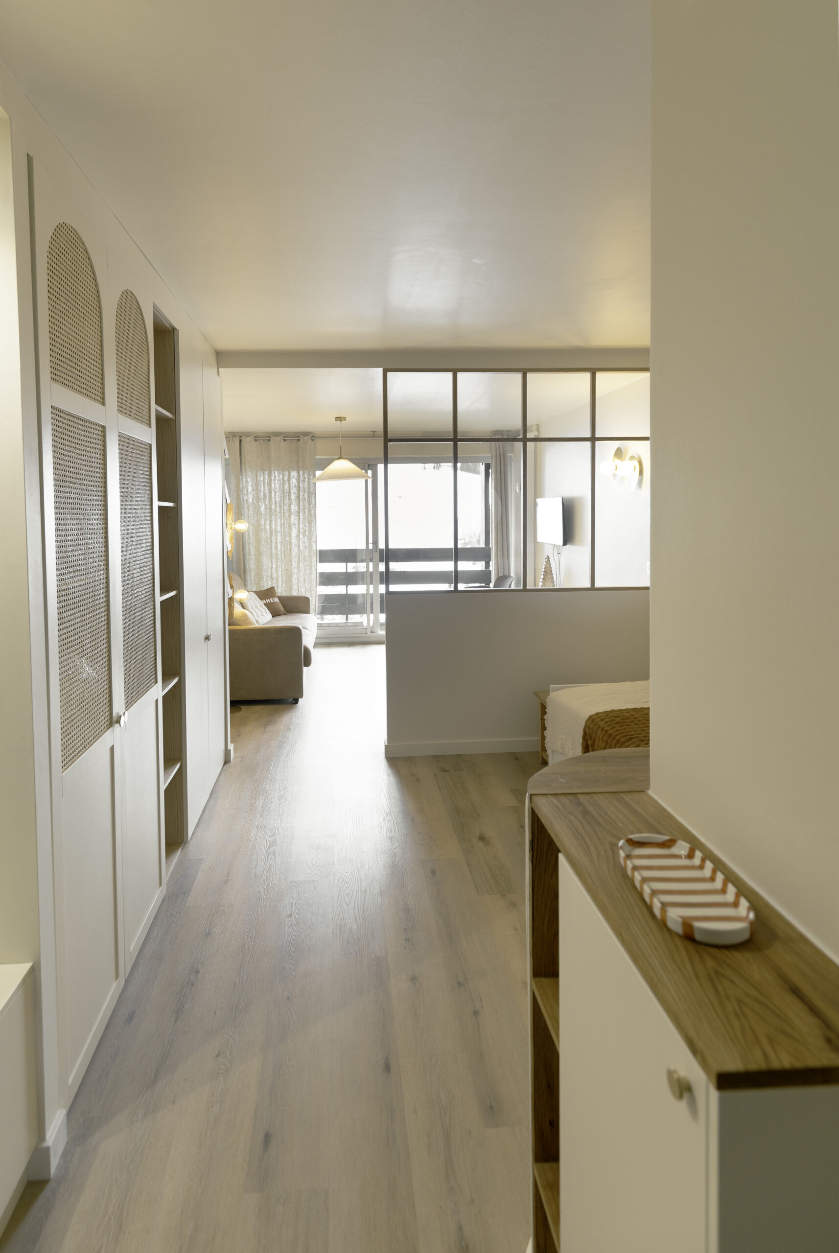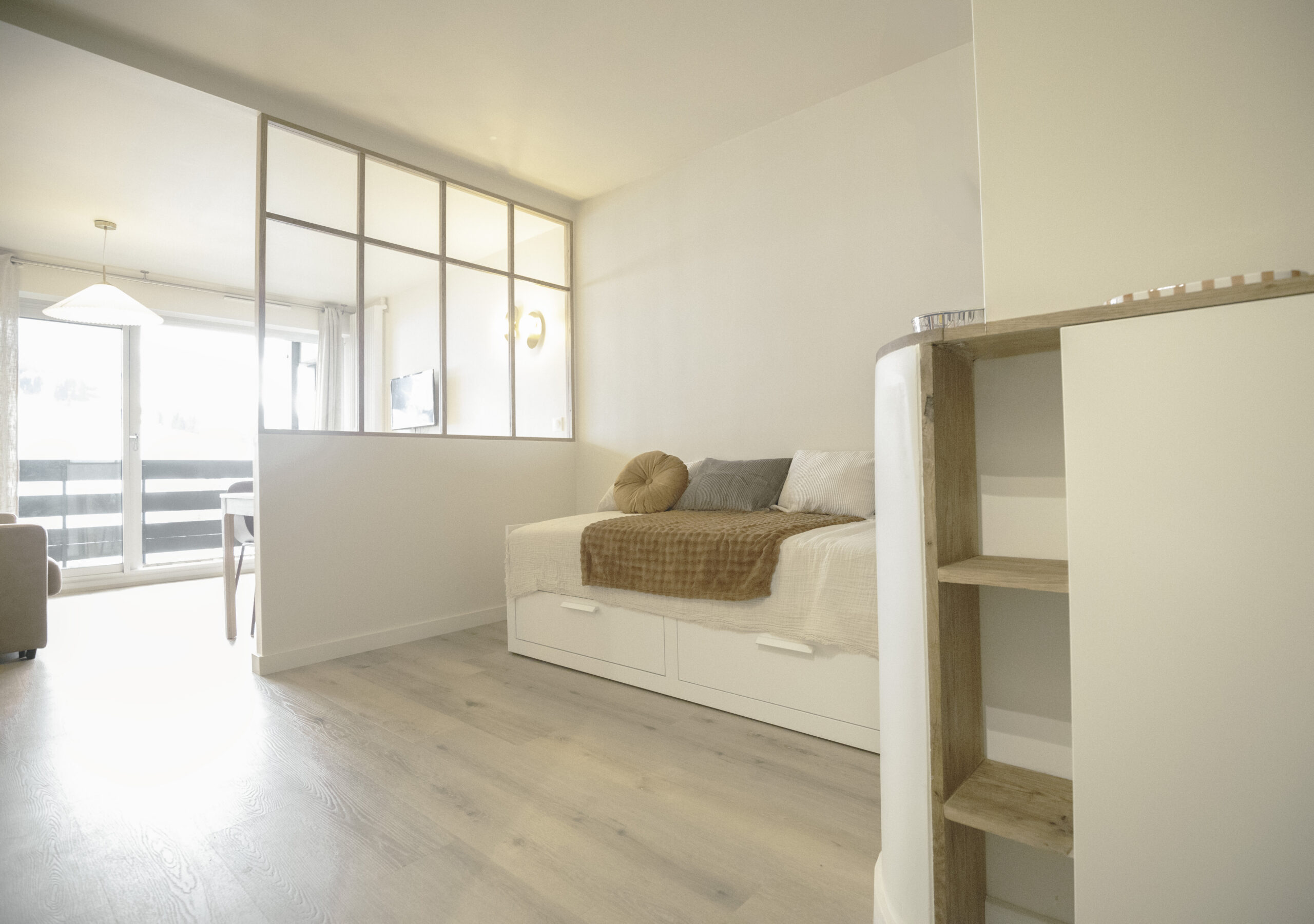 Élisabeth est tombée sous le charme de ce studio baigné de lumière, offrant une vue imprenable sur les montagnes environnantes. Séduite par l’espace, elle souhaitait cependant un intérieur plus fonctionnel et chaleureux, sans perdre en luminosité.