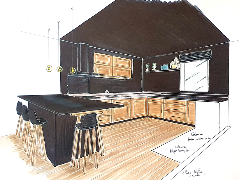 Coté déco, les propriétaires on osé les look total noir pour les murs et plafond de la cuisine. Un pari osé mais qui permet de marquer les espaces et d’apporter un côté très chaleureux et cosy à cette cuisine très lumineuse.
