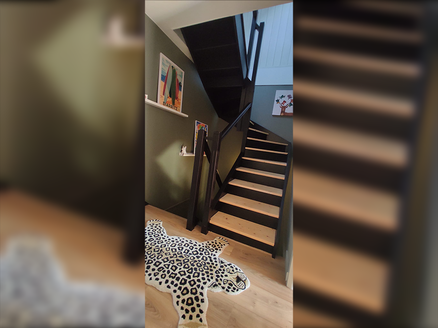 La cuisine a été totalement métamorphosée et pourtant c’est toujours la même. Nous avons modifié le sens de circulation et conservé les meubles en chêne et le plan de travail en granit. Pour le reste, nous avons opté pour un nouveau plan de travail en Dekton noir et 2 nouvelles colonnes noir mat pour accueillir le frigo et le four et micro-onde. Et nous avons harmonisé l’ensemble en changeant les poignées de portes.
